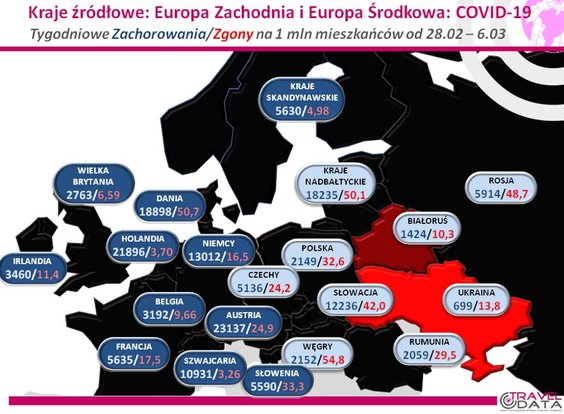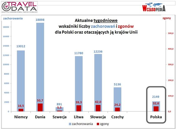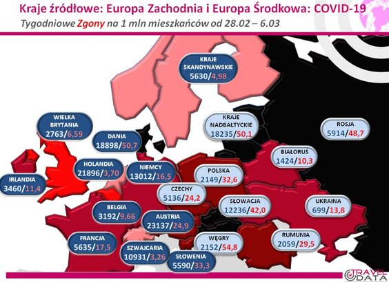 W ostatnich trzech tygodniach wskaźnik liczby zgonów dla Polski spadł z 40,2 do 32,6 i nadal był znacząco wyższy od średniego wskaźnika w krajach źródłowych Europy Zachodniej (13,2), ale już nieznacznie niższy już od wskaźnika dla naszej części kontynentu, który w ostatnim tygodniu wyniósł 36,4. Wyższymi wskaźnikami legitymują się obecnie Łotwa (63,6), Węgry (54,8), Estonia (52,6), Bułgaria (50,7), Dania (50,7), Rosja (48,7), Chorwacja (44,4), Słowacja (42,0), Litwa (39,3), Grecja (37,2), Słowenia (33,3).