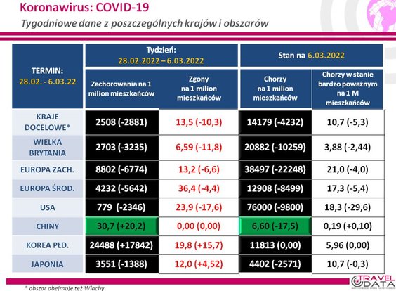 W Japonii odnotowano kolejną poprawę sytuacji epidemicznej, gdyż wskaźnik nowych zakażeń spadł w tym czasie z 4939 do 3551 przypadków na milion. Z kolei w Korei Południowej tygodniowe wskaźniki epidemiczne przez wiele poprzednich miesięcy wykazywały nieduże wahania, ale w ostatnich trzech tygodniach wzrost ten był kontynuowany i osiągnął już bardzo wysoki poziom (nawet jak na warunki europejskie) 24488 przypadków na milion mieszkańców.