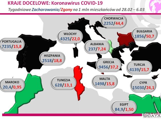 Obok Hiszpanii spadki liczby nowych zakażeń odnotowano we wszystkich krajach docelowych. Najistotniejsze z nich odnotowano w Portugalii (z 16597 do 7235), Włoszech (z 8006 do 4325), Chorwacji (z 2252), Albanii (z 1267 do 237), Bułgarii (z 5991 do 1856) i Turcji (z 7928 do 4139).