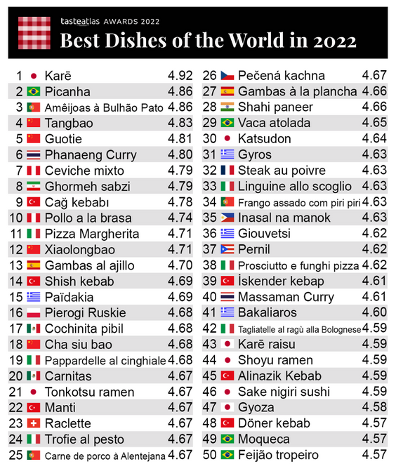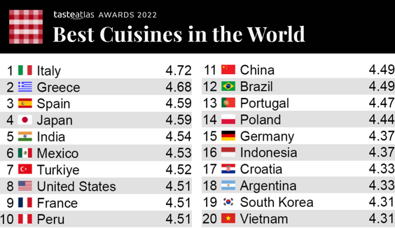 Internetowy przewodnik turystyczny po kuchniach świata TasteAtlas co roku przyznaje nagrody w kategoriach takich jak „Najlepsze danie tradycyjne” i „Najlepsza kuchnia”. Przez cały rok ludzie oceniają ponad 15 tysięcy potraw i napojów, które są częścią bazy danych tego portalu. Baza powstaje z kolei na podstawie recenzji i rekomendacji profesjonalistów i krytyków gastronomii.