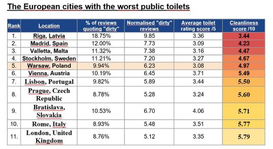 Nie najlepiej wypadła też Warszawa z wynikiem 4,97, co daje jej piąte miejsce. Prawie 10 procent recenzji warszawskich toalet zawiera synonimy słowa „brudny”. „Wynik 4,97 na 10 plasuje Warszawę znacznie poniżej pożądanego poziomu czystości” - komentują autorzy badania. Z kolei średnia ocena toalet publicznych w Warszawie wynosi zaledwie 3,08 na 5, co dowodzi „niezadowalających wrażeń” recenzentów.