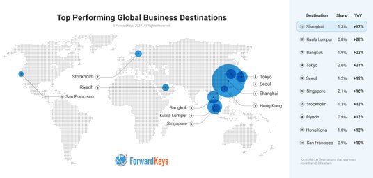 Na podium weszły również Bangkok z 2,4-procentowym udziałem w rynku i Tokio z 2,1-procentowym udziałem, ale ze znacznie większymi wzrostami - odpowiednio o 30 procent i 36 procent.