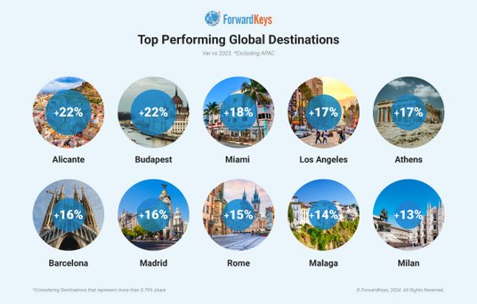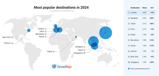 Pierwszą dziesiątkę uzupełniają Paryż (mimo że był gospodarzem olimpijskich, zanotował zaskakująco skromny wzrost), Dubaj, Barcelona, Rzym, Cancún, Nowy Jork i Singapur.