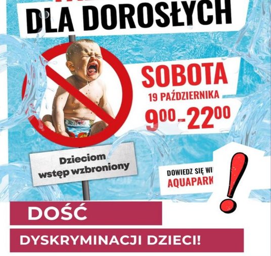 W październiku zeszłego roku łódzki Aquapark Fala zamieścił na Facebook ogłoszenie o treści: „Fala tylko dla dorosłych. Dzień na basenie bez chlapania, dziecięcych pisków i kolejek na zjeżdżalnie? Tak! W sobotę, 19 października, w Aquaparku Fala mogą się bawić wyłącznie osoby pełnoletnie” - pisze biuro Rzecznika Praw Dziecka w komunikacie prasowym.