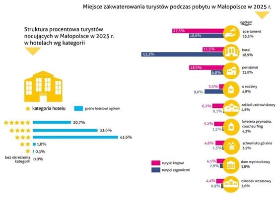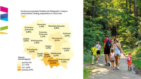 Jeśli chodzi o turystów krajowych, najwięcej Małopolskę poznawało samych mieszkańców tego regionu (36,8 procent wszystkich). W drugiej kolejności goście przyjeżdżali z ościennych województw, jak śląskie (22 procent), podkarpackie (7 procent) i świętokrzyskie (4 procent), a także mazowieckie (9 procent).
