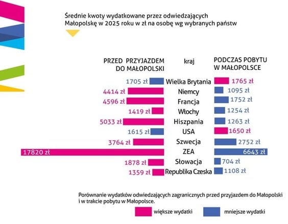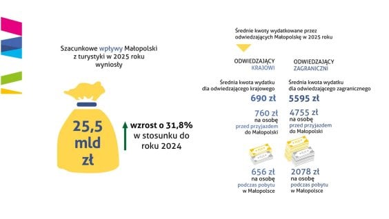 Goście wydali w regionie rekordowe 25,5 miliarda złotych. Jak policzyli badający ruch turystyczny w Małopolsce, to o 31,8 procent więcej niż w roku 2024 Średnie wydatki wyniosły 656 złotych na osobę w wypadku turystów krajowych i 2078 złotych na osobę u turystów zagranicznych.