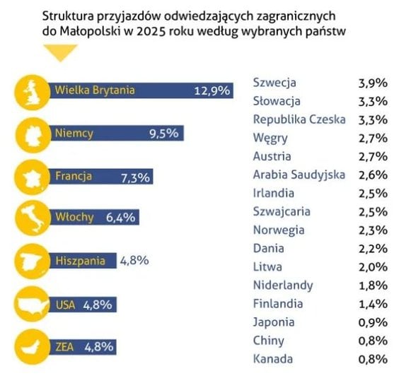 W tej liczbie 3,8 miliona to goście z zagranicy (wliczając jednodniowych). W tej drugiej grupie najwięcej było ich z Wielkiej Brytanii, Niemiec, Francji i Włoch, a dalej z Hiszpanii, Stanów Zjednoczonych i Zjednoczonych Emiratów Arabskich. Turyści z tych siedmiu krajów stanowili razem ponad 43 procent obcokrajowców odwiedzających Małopolskę.