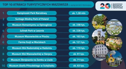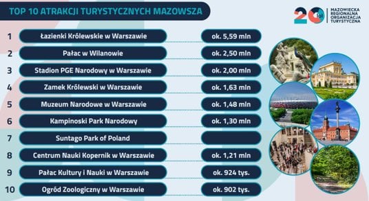 Wśród mazowieckich atrakcji turystycznych niezmiennie prym wiodą instytucje warszawskie: Muzeum Łazienki Królewskie (5,6 miliona zwiedzających), Muzeum Pałacu Króla Jana III w Wilanowie (2,5 miliona) i Stadion PGE Narodowy (2 miliony). Miejsca poza podium zajęły Zamek Królewski w Warszawie (1,6 miliona), Muzeum Narodowe w Warszawie (1,5 miliona), Kampinoski Park Narodowy (1,3 miliona), Suntago – Park of Poland (nie zezwala na upublicznienie danych), Centrum Nauki Kopernik w Warszawie (1,2 miliona), Pałac Kultury i Nauki w Warszawie (924 tysiące) i Miejski Ogród Zoologiczny w Warszawie (902 tysiące).
