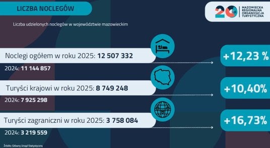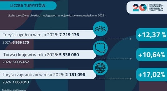 W ubiegłym roku region odwiedziło 5,5 miliona turystów krajowych (o 10,6 procent więcej niż w 2024 roku) i 2,2 miliona turystów zagranicznych (o 17 procent więcej), co daje w sumie 7,7 miliona turystów (wzrost o 12,4 procent). Pod względem liczby turystów Mazowsze uplasowało się na pierwszym miejscu w Polsce, przed Małopolską (6,7 miliona turystów) i Dolnym Śląskiem (5,1 miliona).