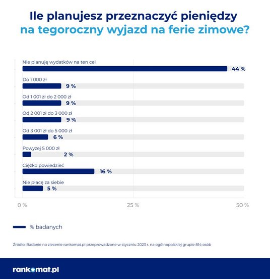 Jedynie 2 procent badanych zamierza wydać na ferie więcej niż 5000 złotych. Pozostali nie wydadzą ani złotówki (44 procent), zamierzają zmieścić się w mniejszej kwocie (33 procent) lub nie wiedzą, ile wydadzą (16 procent).