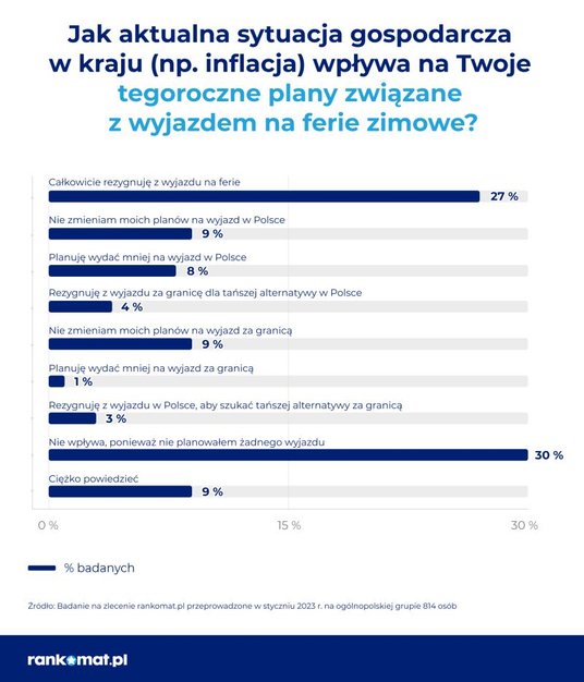 Z badania wynika również, że 9 procent ankietowanych zostaje w Polsce, nie zmieniając założonych wcześniej planów, a 4 procent rezygnuje z wyjazdu za granicę na rzecz tańszego pobytu w kraju. 8 procent planuje wydać mniej na ferie w Polsce, natomiast 9 procent nie zmieni planów związanych z wyjazdem za granicę. Jedynie 1 procent ankietowanych planuje wydać mniej na wyjazd za granicę, a 3 procent rezygnuje z ferii w Polsce, szukając tańszych rozwiązań w innych krajach.