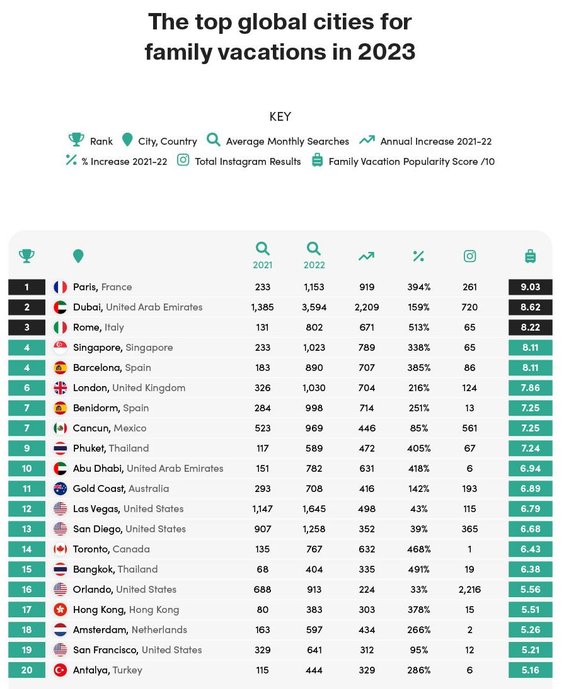 Amerykański portal The Family Vacation Guide (ang. przewodnik po rodzinnych wakacjach) przygotował podpowiedzi dla rodziców planujących wakacyjne wyjazdy z dziećmi. Ułożył ranking krajów i miast, w których nie będą się nudzić. A tak naprawdę to skorzystał z ich własnych wyborów, bo stworzył listę na podstawie wyników wyszukiwania w Google'u i relacji z wakacji w 2022 roku zamieszczonych przez rodziny w Instagramie (metodyka niżej). Są to więc rankingi miejsc najpopularniejszych wśród amerykańskich rodziców.