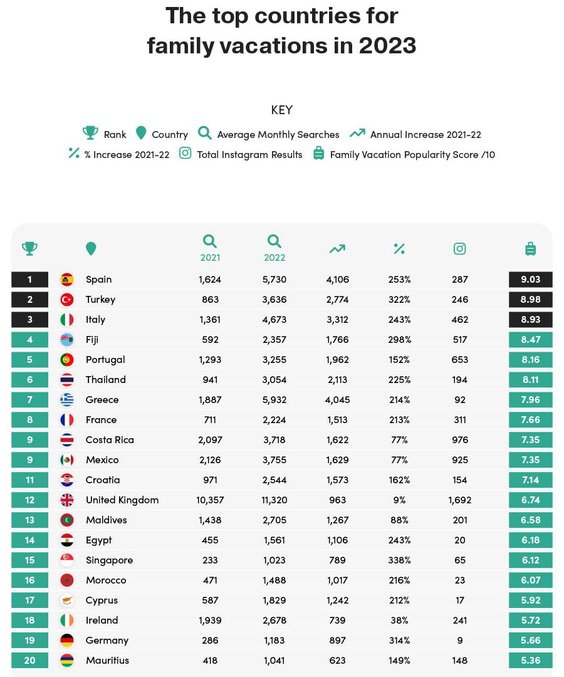 Każdemu kierunkowi autorzy przypisali oceny. Wśród krajów najwięcej, bo 9,03 punktu, zebrała Hiszpania. Za nią znalazły się Turcja (8,98 punktu) i Włochy (8,93 punktu).