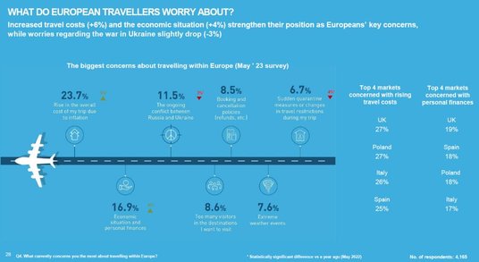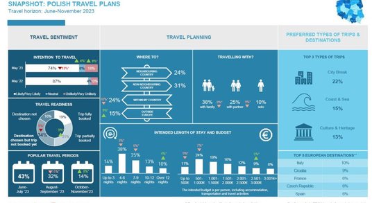 69 procent Europejczyków, czyli o 4 procent mniej niż w ubiegłym roku, planuje podróż między czerwcem a listopadem 2023 roku - wynika z danych zebranych przez Europejską Komisję Podróży (European Travel Commission - ETC) w maju tego roku na 10 największych europejskich rynkach źródłowych (Niemcy, Wielka Brytania, Francja, Holandia, Włochy, Belgia, Szwajcaria, Hiszpania, Polska i Austria) w ramach cyklicznych badań zapoczątkowanych w sierpniu 2020 roku.
