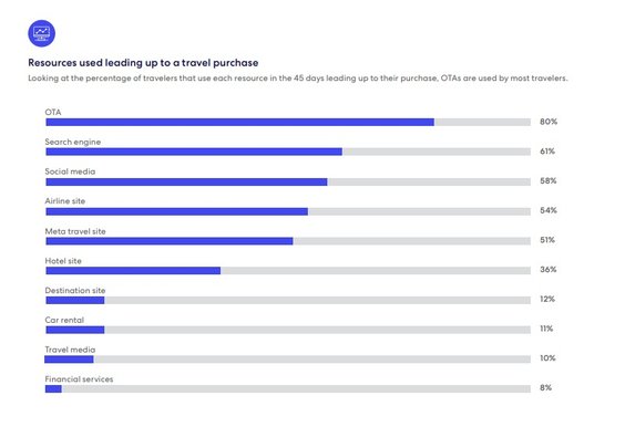 We wczesnej fazie planowania wyszukiwanie jest bardziej rozłożone w czasie (około 2,5 odsłon dziennie), ale na kilka dni przed rezerwacją rośnie wykładniczo, by w dniu zakupu dojść do 25 odsłon. 80 procent pytanych korzysta przy tym ze stron internetowych agentów turystycznych (OTA), 61 procent z wyszukiwarek, 58 procent z mediów społecznościowych, 54 procent portali linii lotniczych, a 51 procent z metawyszukiwarek. Czterech na pięciu podróżnych odwiedza strony OTA na jakimś etapie poszukiwań, co można tłumaczyć tym, że prawdopodobnie sprawdzają ofertę biur internetowych, by się zainspirować, sprawdzić coś lub zaplanować, nawet jeśli ostatecznie dokonują rezerwacji na innej stronie internetowej.