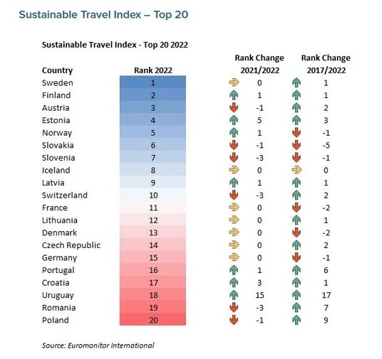 Euromonitor International przygotował kolejną edycję rankingu krajów, które w kontekście turystycznym rozwijają się w zrównoważony sposób, podaje firma w komunikacie prasowym. W zestawieniu pojawiło się 20 państw, z czego 19 to kraje należące do Unii Europejskiej i strefy Schengen. Członkowie wspólnoty zajmują też 17 pierwszych pozycji.