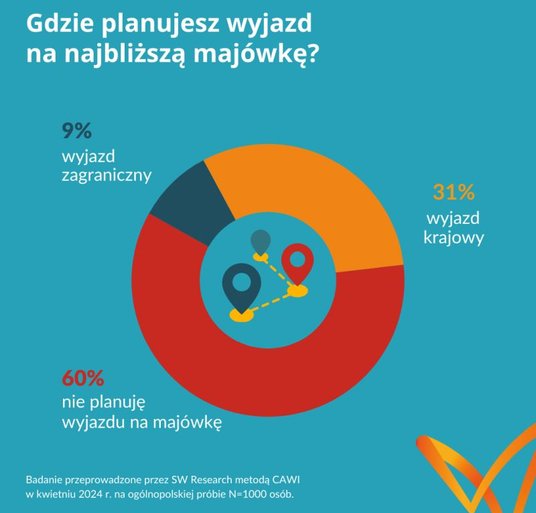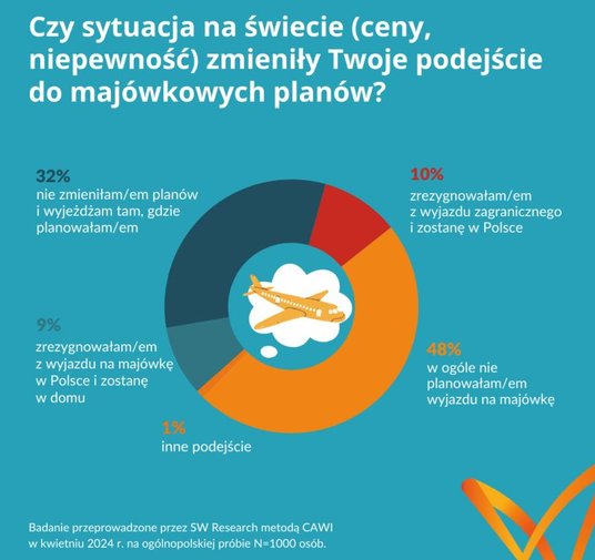 Zaledwie 9 procent badanych zrezygnowało z majówkowych wyjazdów ze względu na niepewną sytuację na świecie. Spośród nich 10 procent zrezygnowało z wyjazdu zagranicznego i zostanie w Polsce. Majówkowych planów nie zmienił co trzeci badany (32 procent). Natomiast 48 procent respondentów w ogóle nie planowało wyjazdu na majówkę i podtrzymuje tę decyzję.