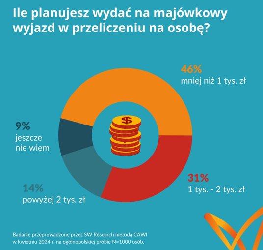 Prawie co drugi Polak planuje wydać na wyjazd majówkowy mniej niż tysiąc złotych na osobę (46 procent). Jednak w ciągu dwóch lat (od ostatniej edycji badania) wydatki Polaków na majówkę zwiększyły się - więcej osób wyda wyższe kwoty. 31 procent szacuje swoje wydatki na 1- 2 tysiące złotych (26 procent w 2022 roku), a 14 procent planuje przekroczyć kwotę 2 tysięcy (10 procent w 2022 roku).