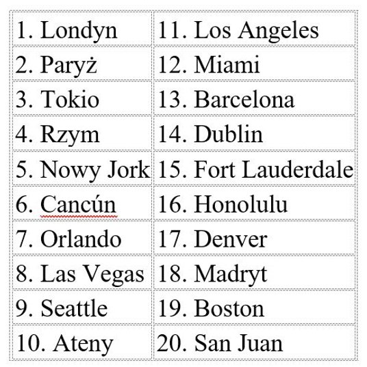 Pierwsza dwudziestka wygląda nieco inaczej niż rok temu. Meksykański kurort Cancún, który w 2023 roku zajął pierwszą pozycję na liście, w tym roku spadł na szóstą, a jego miejsce zajął Londyn.