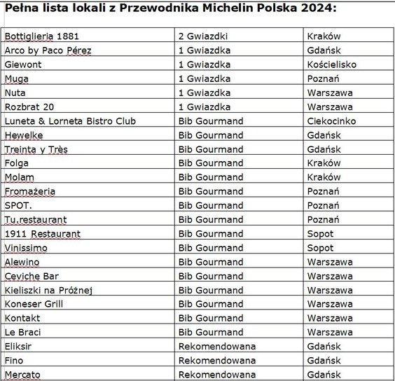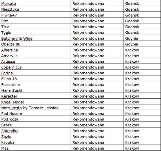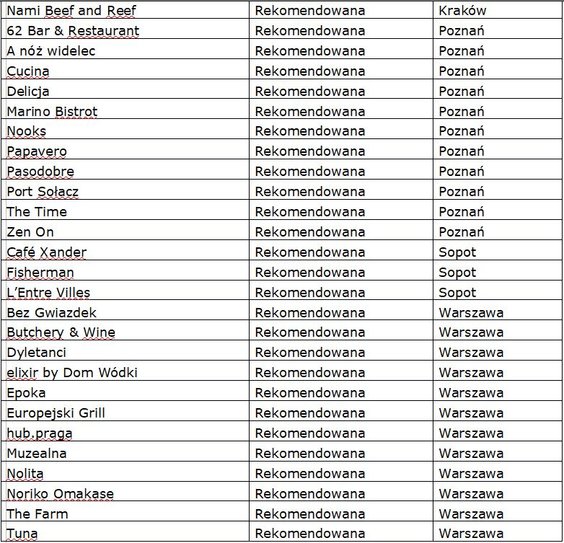 W sumie przewodnik uwzględnia 77 restauracji, w tym trzy nowe lokale, które pierwszy raz zasłużyły na jedną gwiazdkę. Są to Arco by Paco Pérez w Gdańsku. Rozbrat 20 w Warszawie i Giewont w Zakopanem.