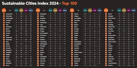 Publikowany od 2015 roku przez firmę Arcadis ranking stu najbardziej zrównoważonych miast na świecie (The Arcadis Sustainable Cities Index 2024) jest, wedle jego twórców, miernikiem kondycji środowiskowej, społecznej i ekonomicznej miast.