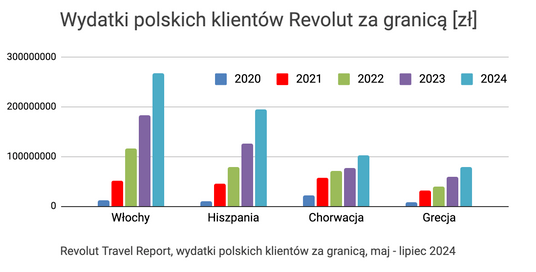 Kto zarobił na turystach z Polski? Od maja do lipca klienci Revoluta najwięcej wydali we Włoszech (268 milionów złotych, plus 46 procent), w Hiszpanii (196 milionów złotych, plus 55 procent), Chorwacji (102 miliony złotych, plus 32 procent) i Grecji (79 milionów złotych, plus 33 procent).