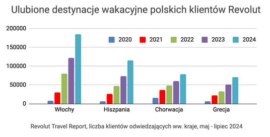 W badaniu Revolut Travel Report z marca br. najwięcej polskich klientów Revoluta planowało urlop w Chorwacji (5,5 procent wskazań), we Włoszech (5,4 procent), w Grecji (5,3 procent), Hiszpanii (5,2 procent) i Turcji (3,1 procent). Poza Europą liderem był Egipt (1,1 procent).