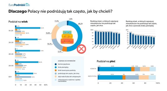 Najczęściej wskazywaną przeszkodą są finanse - 48,2 procent respondentów przyznaje, że brak pieniędzy wpływa na ich plany podróżnicze. Na drugim miejscu znalazła się zbyt mała liczba dni urlopowych (16,8 procent). Dla niektórych ograniczeniem są również zobowiązania rodzinne (11,5 procent), brak towarzysza podróży (5,3 procent) i bariera językowa (1,9 procent), choć te czynniki mają zdecydowanie mniejsze znaczenie niż kwestie finansowe i czasowe.