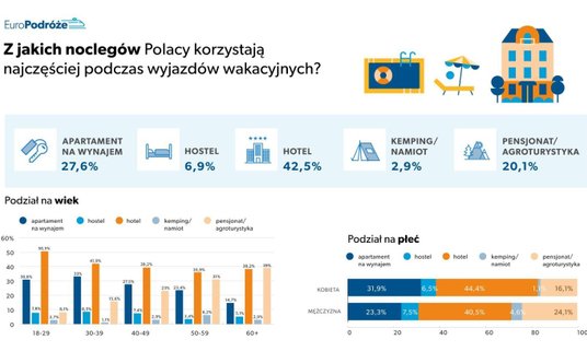 Największą popularnością wśród respondentów cieszą się hotele - wskazało je 42,5 procent badanych. Tego typu obiekty są wyjątkowo popularne wśród najmłodszych respondentów (18-29 lat). Dla tej grupy kluczowe jest wygodne, kompleksowe rozwiązanie (wyżywienie, dobra lokalizacja i minimum organizacji własnej).
