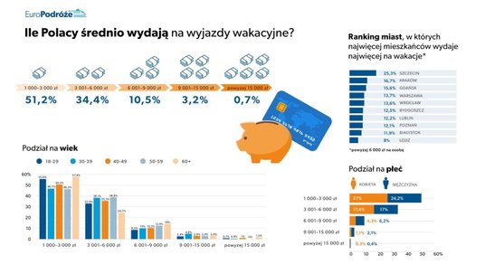 Wakacyjny portfel Polaka zależy w dużej mierze od miejsca zamieszkania. Na czele zestawienia znajduje się Szczecin - aż 25,3 procent jego mieszkańców wydaje na urlop ponad 6000 złotych. Za nim uplasowały się Kraków (16,7 procent), Gdańsk (15,6 procent) i Warszawa (13,7 procent). To duże miasta z rozwiniętym rynkiem pracy i rosnącymi zarobkami. Większe wydatki wakacyjne mogą też wynikać z lepszej siatki połączeń i szerszej oferty biur podróży, co sprzyja dalszym, a więc droższym wyjazdom.