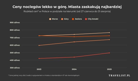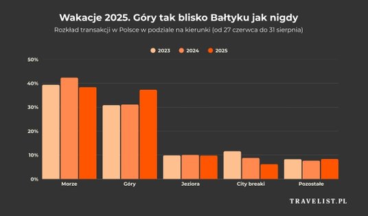 – Pierwszy raz od lat różnica jest tak mała. Jeszcze w 2024 roku wakacje nad Bałtykiem cieszyły się popularnością większą o 11 punktów procentowych od tych w południowych regionach Polski. Natomiast niesprzyjające warunki pogodowe w lipcu przy cenach noclegów w kurortach nadmorskich wyższych o średnio 14 procent sprawiły, że wiele osób elastycznie dostosowało swoje plany urlopowe i wybrało góry – wyjaśnia Eliza Maćkiewicz, dyrektor ds. handlowych w Travelist.pl.