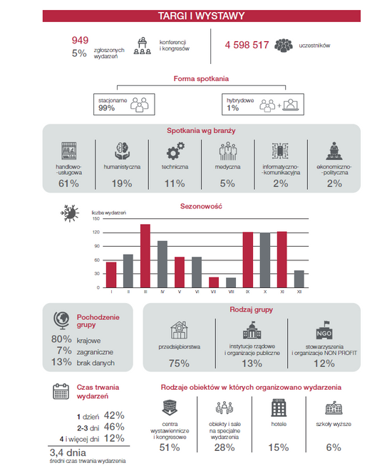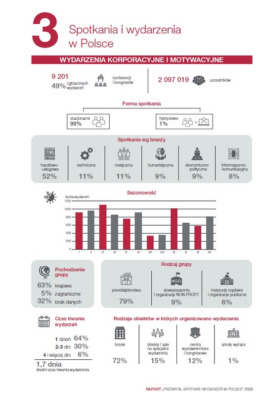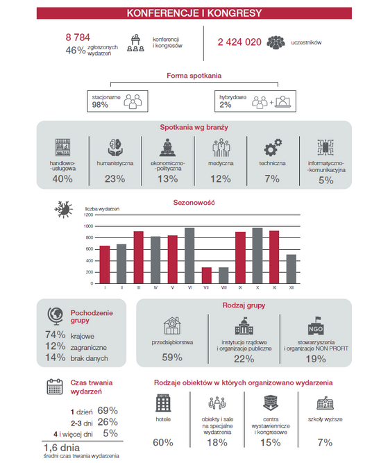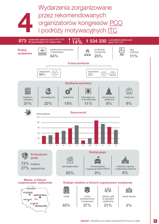 Zmieniła się natomiast struktura typów organizowanych wydarzeń. W 2024 roku dominowały wydarzenia korporacyjne i motywacyjne, które stanowiły 49 procent wszystkich spotkań, co oznacza wzrost o 8 punktów procentowych względem roku poprzedniego. Konferencje i kongresy odpowiadały za 46 procent wydarzeń, notując spadek o 8 punktów procentowych, natomiast targi i wystawy utrzymały udział na poziomie 5 procent.