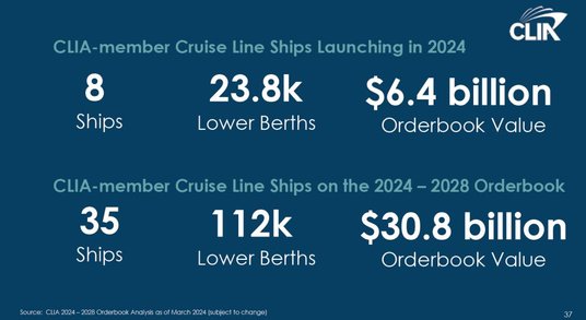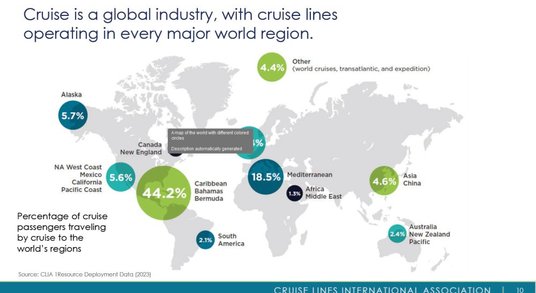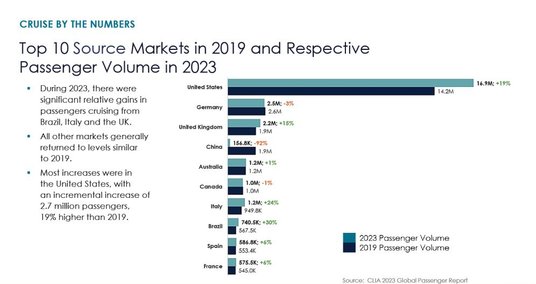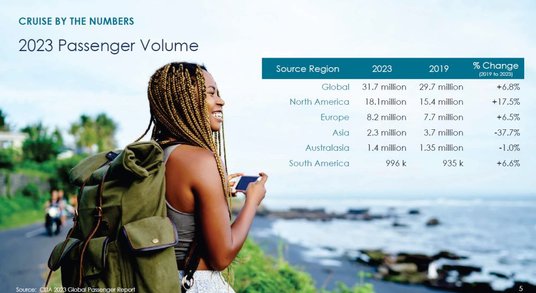 Statki wycieczkowe przewiozły w sumie 31,7 miliona pasażerów, najwięcej w Ameryce Północnej - 18,1 miliona (wzrost o 17,5 procent), za którą uplasowała się Europa z 8,2 miliona pasażerów (plus 6,5 procent). Trzecie miejsce zajęła się Azja z wynikiem 2,3 miliona pasażerów (minus 37,7 procent).
