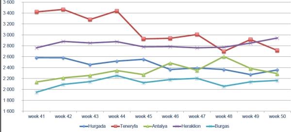 Wysokie miejsce Hiszpanii wyjaśnia lista najczęściej wybieranych kierunków. Otwiera je Fuerteventura. Na wysokich miejscach znalazły się też inne Wyspy Kanaryjskie: Teneryfa na czwartym, Lanzarote na piątym, a Gran Canaria na ósmym. Wyjąwszy miejsce dziesiąte, które przypadło tureckiej Antalyi i siódme dla egipskiego Marsa Alam, pozostałe w pierwszej dziesiątce pozycje zajęły kierunki greckie: Heraklion (drugie), Rodos (trzecie), Zakintos (szóste) i Korfu (dziewiąte).