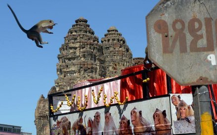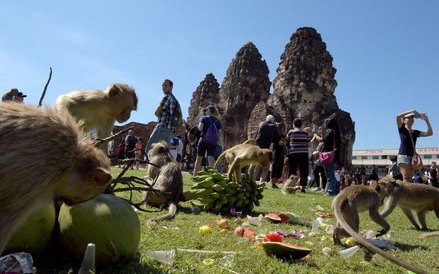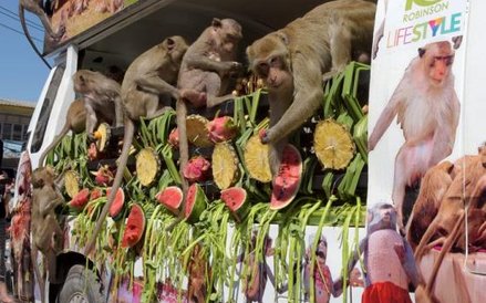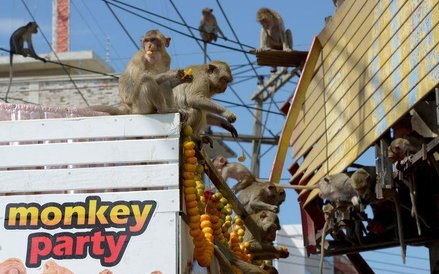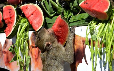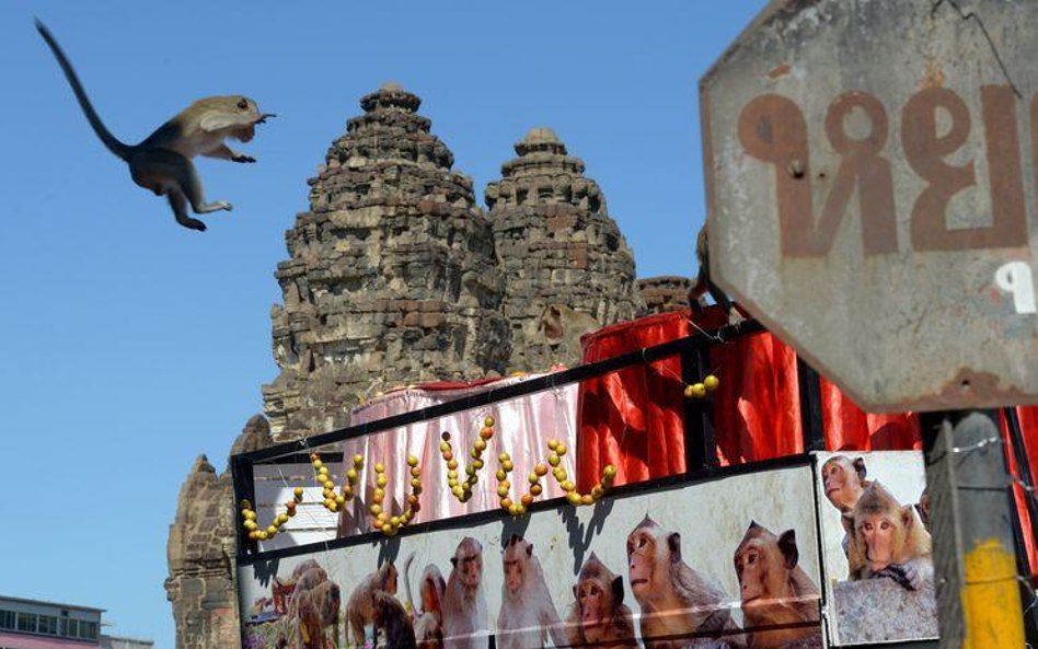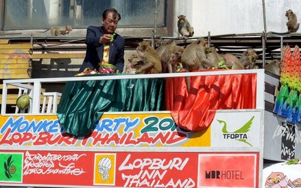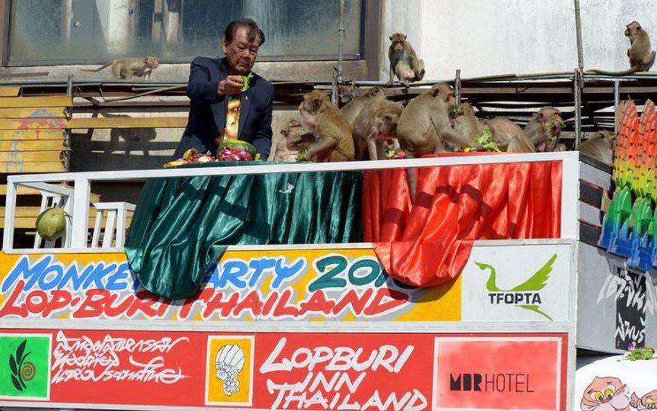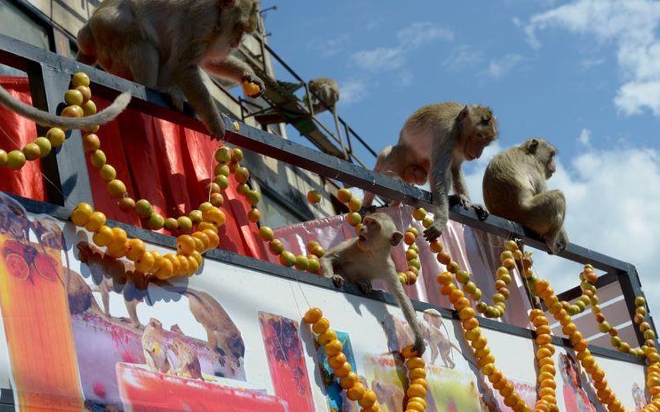 Elegancko zastawione stoły, przy których krzątają się prawdziwi kelnerzy, ale i karkołomne konstrukcje z owoców i zwykłe owocowe górki - tak wygląda uczta przygotowywana co roku dla małp z Lopburi w Tajlandii