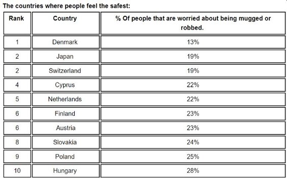 Z ogólnym wynikiem 7,51 na 10 punktów Japonia zajmuje pierwsze miejsce jako najbezpieczniejszy kierunek turystyczny na świecie. Na drugim miejscu znajduje się Słowacja z rezultatem 7,46 punktu, na trzecim Cypr, który uzyskał 7,39 punktu. W tej punktacji Polska uzyskała 6,48 punktu, co dało jej ósme miejsce.
