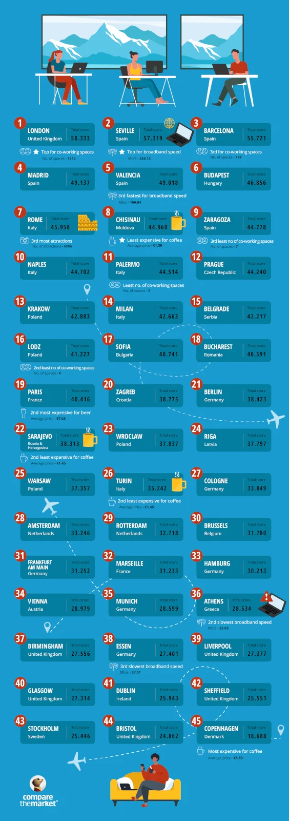 Za najlepsze miejsce, by połączyć wypoczynek z pracą zdalną, eksperci od ubezpieczeń uznali Londyn, w którym nie dość, że można wybierać spośród 1312 miejsc do pracy współdzielonej, to jeszcze jest tu dużo do zobaczenia, w mieście znajduje się bowiem 8472 atrakcji, a wśród nich takie znane budowle, jak Big Ben i Pałac Buckingham. Nie rozczarują się tu miłośnicy spędzania czasu w pubach i kawiarniach. Stolica Wielkiej Brytanii uzyskała w sumie 58,333 punktu, a jej największą zaletą okazała się w tym kontekście liczba miejsc do co-workingu.