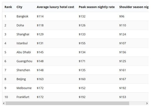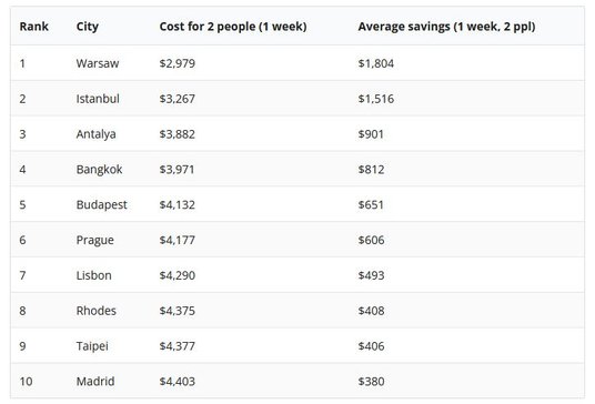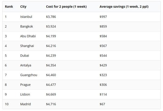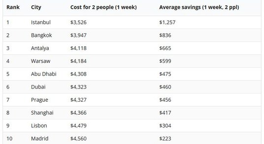 Jeśli wziąć pod uwagę średni koszt lotów w obie strony z Nowego Jorku lub Los Angeles, uśredniony koszt siedmiu noclegów w hotelach o standardzie od jednej do pięciu gwiazdek i trzech posiłków dziennie, a do tego koszty wycieczek, rozrywek i transportu w czasie pobytu, wygrywa Stambuł.