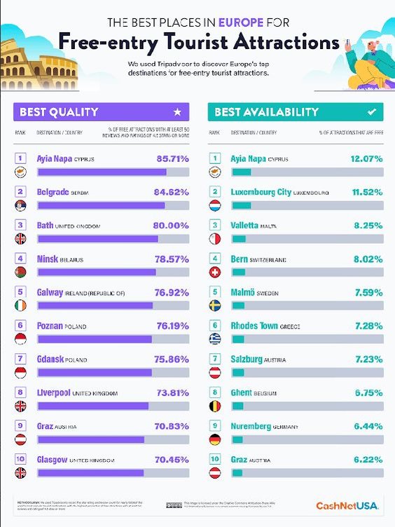 Firma sprawdziła prawie tysiąc najpopularniejszych kierunków na świecie pod kątem budzących ciekawość darmowych atrakcji turystycznych. By mogły być wzięte pod uwagę, musiały uzyskać na portalu TripAdvisor średnią ocenę 4,5 gwiazdki i mieć ponad 50 recenzji.